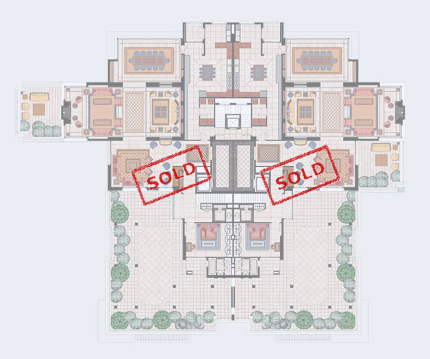 Two 600 square meter Duplexes crown the Residence. The lower level holds the three reception areas, dining room and guest room, while the upper level holds four bedrooms with adjoining bathrooms. The roof level holds a reception area. All three levels include large terraces. [more info]